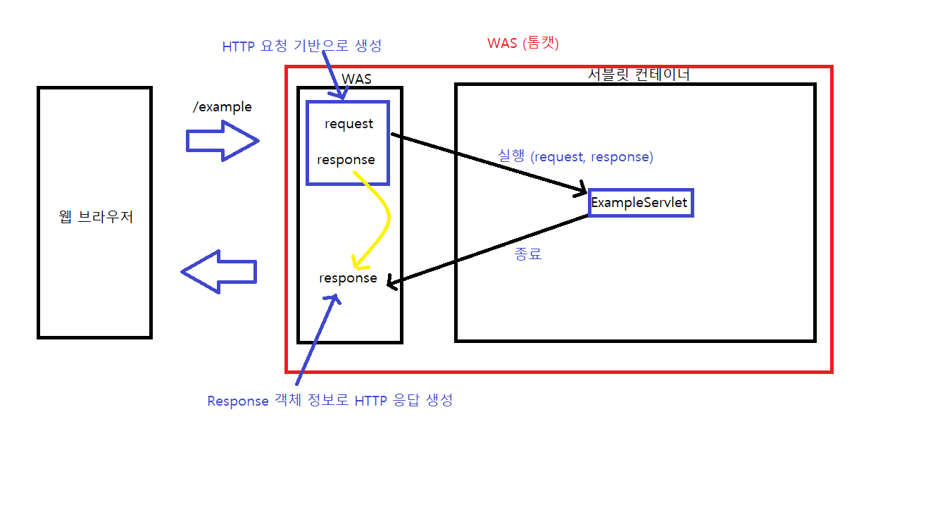 - 개발자는 Request 객체에서 HTTP 요청 정보를 기반으로 Response 객체에 응답 정보 입력