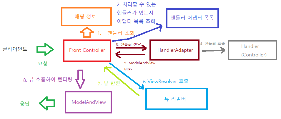 - 따라서, 여러 컨트롤러 인터페이스와 호환 가능하도록 프런트 컨트롤러와 컨트롤러 사이 어댑터를 배치해줘야 합니다.
