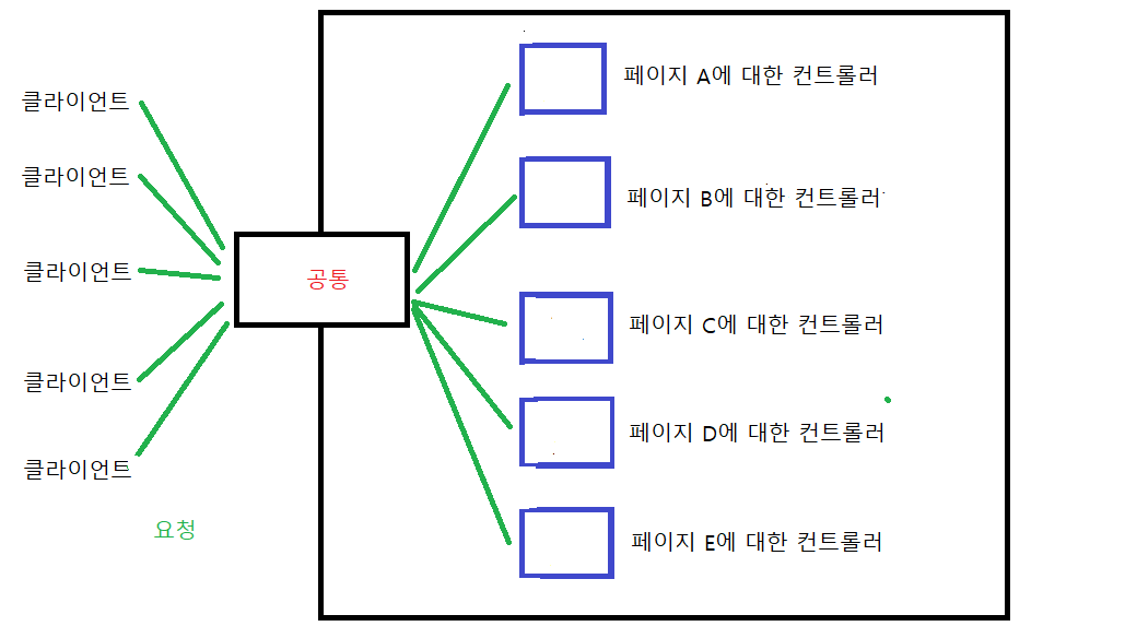 - 서블릿 하나로 클라이언트의 요청을 받음