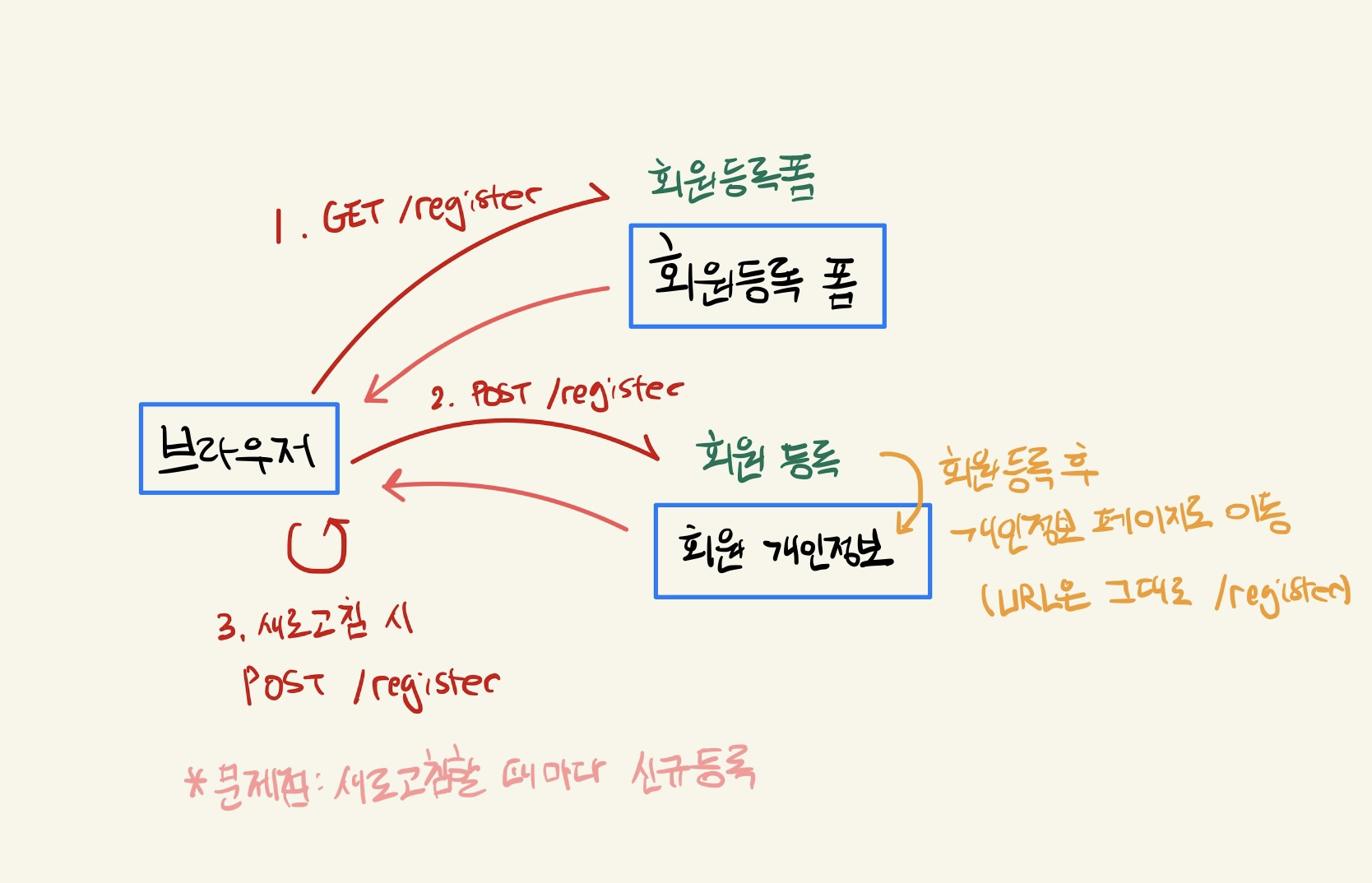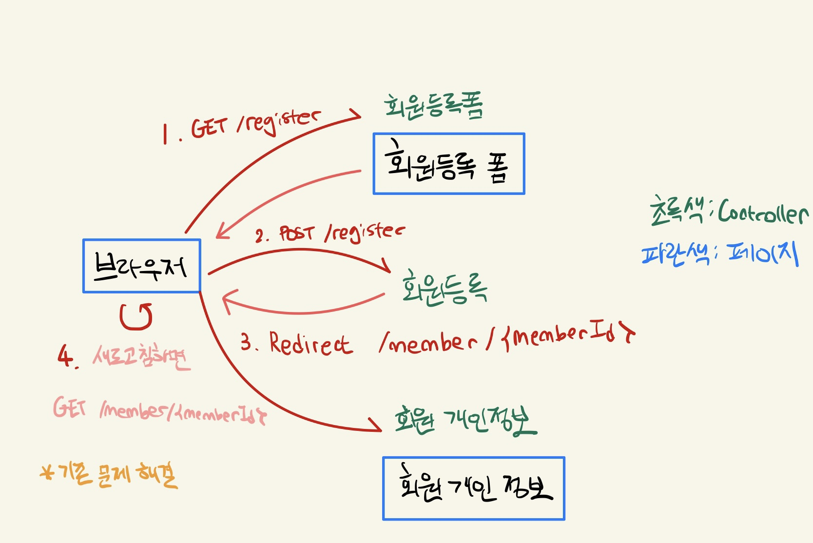 - 앞선 상황에서 문제점은 회원 등록하는 URL에서 변하지 않은 상태에서 새로고침 했기 때문에 발생