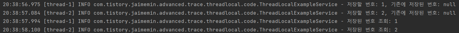 * thread-1이 2초동안 대기하는 동안 thread-2가 numberStorage에 2를 저장하여 thread-1에서도 2가 조회되는 것을 확인할 수 있습니다.