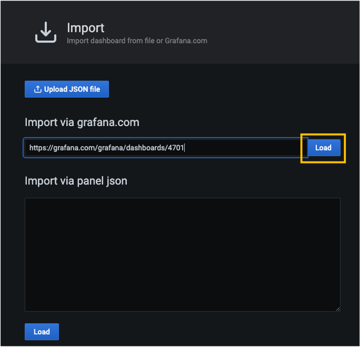 Import를 누르고 https://grafana.com/grafana/dashboards/4701를 입력한 뒤 Load 버튼을 클릭해주면 dashboard 생성이 완료됩니다.