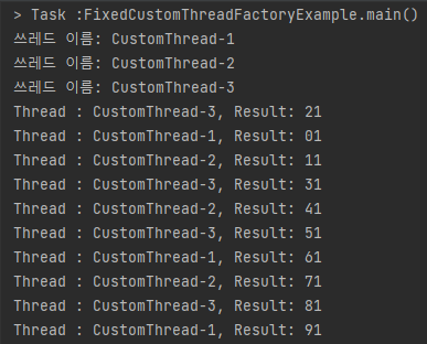 - ThreadFactory를 사용하면 스레드를 직접 생성할 필요 없이 스레드 하위 클래스나 우선순위 등을 설정할 수 있음