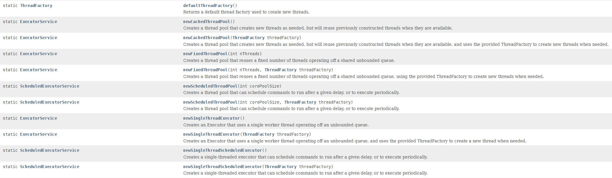 - Executors는 Executor, ExecutorService, ScheduledExecutorService, ThreadFactory 및 Callable 클래스를 위한 유틸리티 팩토리 클래스