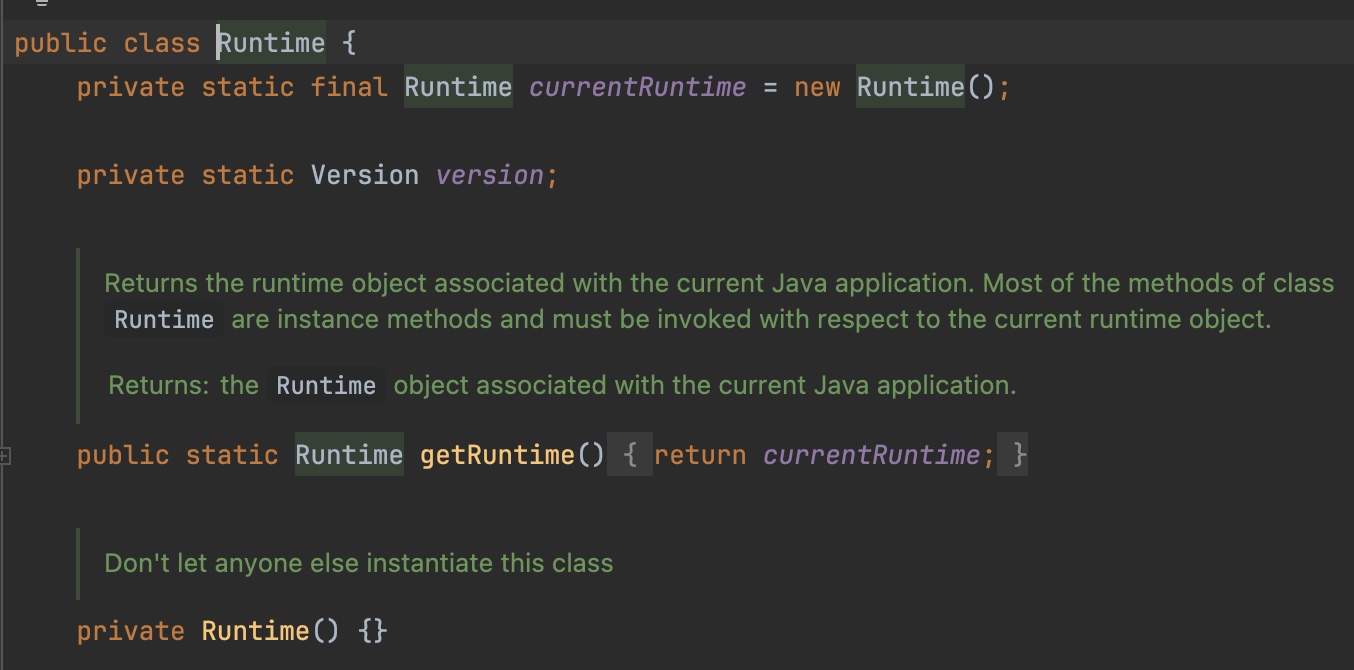 - currentRuntime 인스턴스를 미리 생성하고 getRuntime() 정적 메서드를 통해서만 인스턴스를 반환받도록 구현됨
