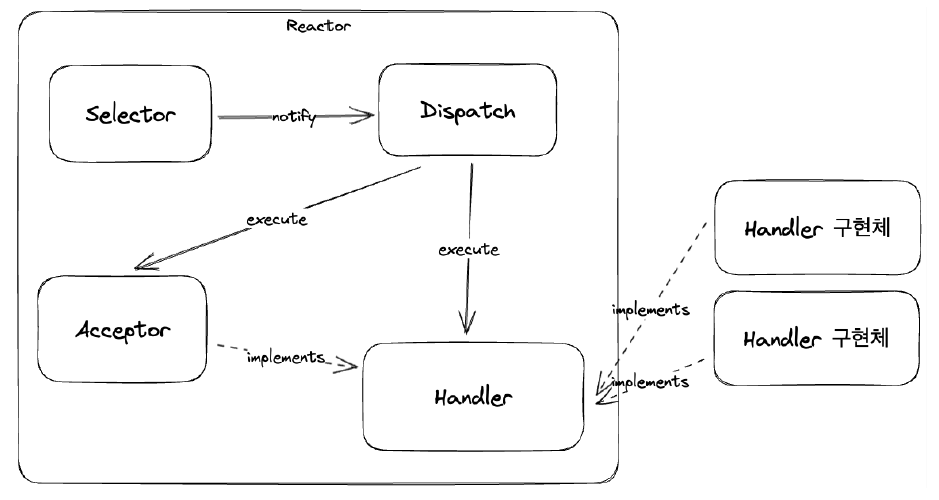 - 해당 패턴은 이벤트 루프를 사용하여 다양한 I/O 이벤트(읽기, 쓰기, 연결 수락 등)를 처리하며, 각 이벤트는 사전에 등록된 핸들러에 의해 처리