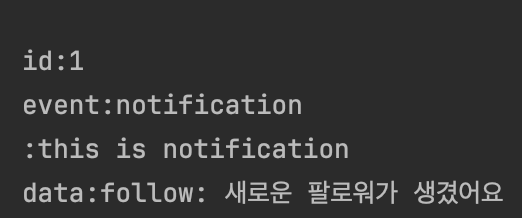 - id: 이벤트의 id를 가리키며 클라이언트에서는 id를 저장해서 Last-Event-ID 헤더를 첨부하고 서버는 해당 id 이후의 이벤트만 전송