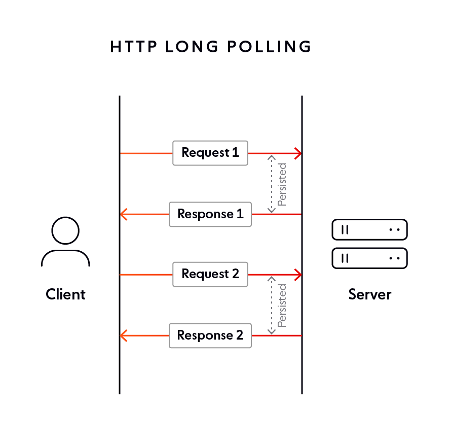 - 클라이언트가 서버에 요청을 보내면, 서버는 즉시 응답하지 않고 새로운 데이터가 생길 때까지 연결을 유지